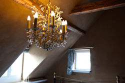 Dieses 22 qm große Mansardenzimmerzimmer ist in den warmen und hellen Erdtönen des Original-Lehmputzes gehalten. Antike Balken, ein opulenter Kronleuchter und natürliche Baumwollstoffe machen es zu einem kuscheligen Rückzugsort.